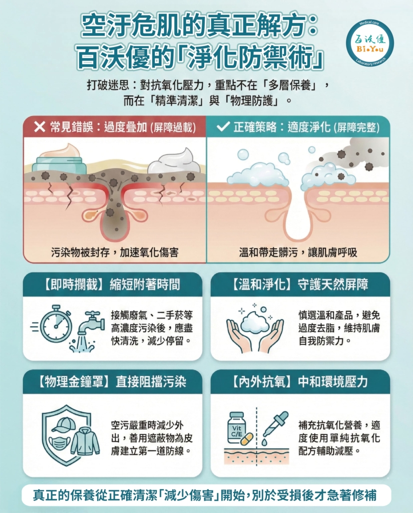 總結來說,皮膚與頭皮就像是人體的「空氣清淨機濾網」。當室外污染與室內污染(如二手菸)源源不絕襲來,這片濾網如果不定期清潔保養,不僅會因為「生鏽」(氧化壓力)而破損,內部的精密零件(細胞與毛囊)也會因為過載而停擺 。